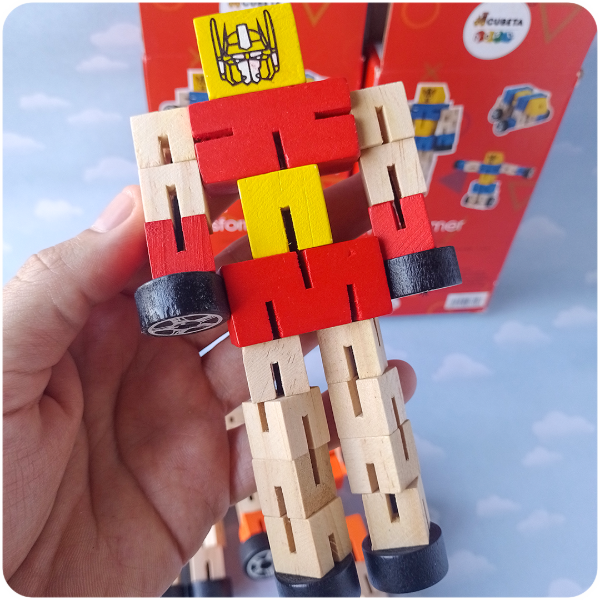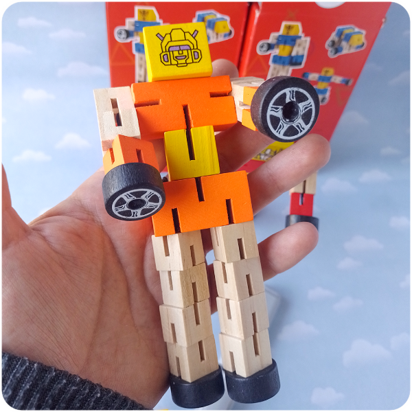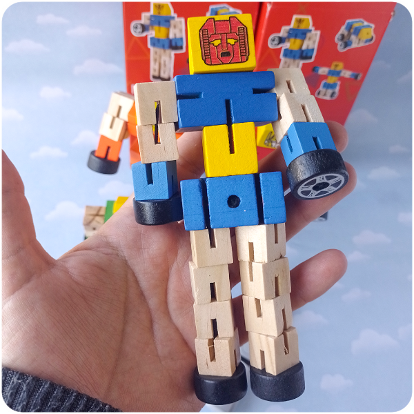 Este encantador muñeco de madera es mucho más que un robot. Con sus articulaciones elásticas, los chicos van a poder cambiar su forma, elevar sus brazos y sentarlo, dándole vida a su creatividad. Su diseño único e interactivo no solo promueve la imaginación, sino que también ¡se transforma en un auto! Es el compañero perfecto para horas de juego activo.